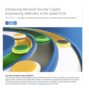 Microsoft teams up with OpenAI GPT-4 to bring #Microsoft Security Copilot. Language models with security and privacy features from #Azure mould a closed-loop learning system that responds to incidents in minutes.